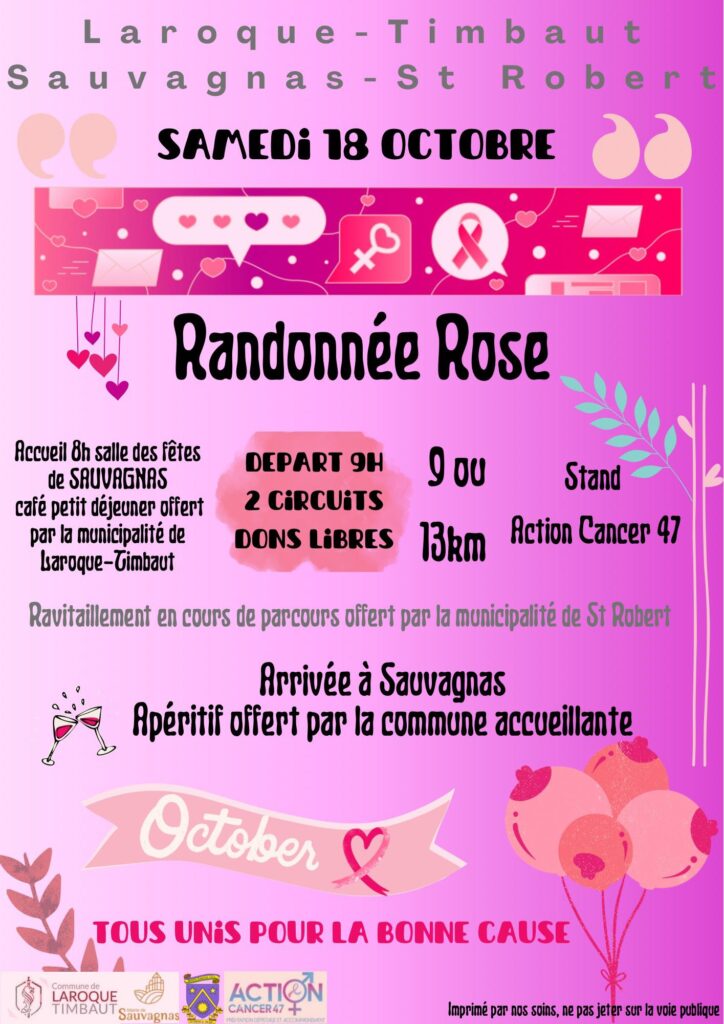 Dans le cadre d’Octobre Rose 2025, les communes de Laroque-Timbaut, Sauvagnas et Saint-Robert s’unissent pour proposer une Randonnée Rose solidaire le samedi 18 octobre 2025. Cette initiative a pour objectif de sensibiliser à la lutte contre le cancer du sein, tout en favorisant la solidarité et le lien entre habitants du territoire.